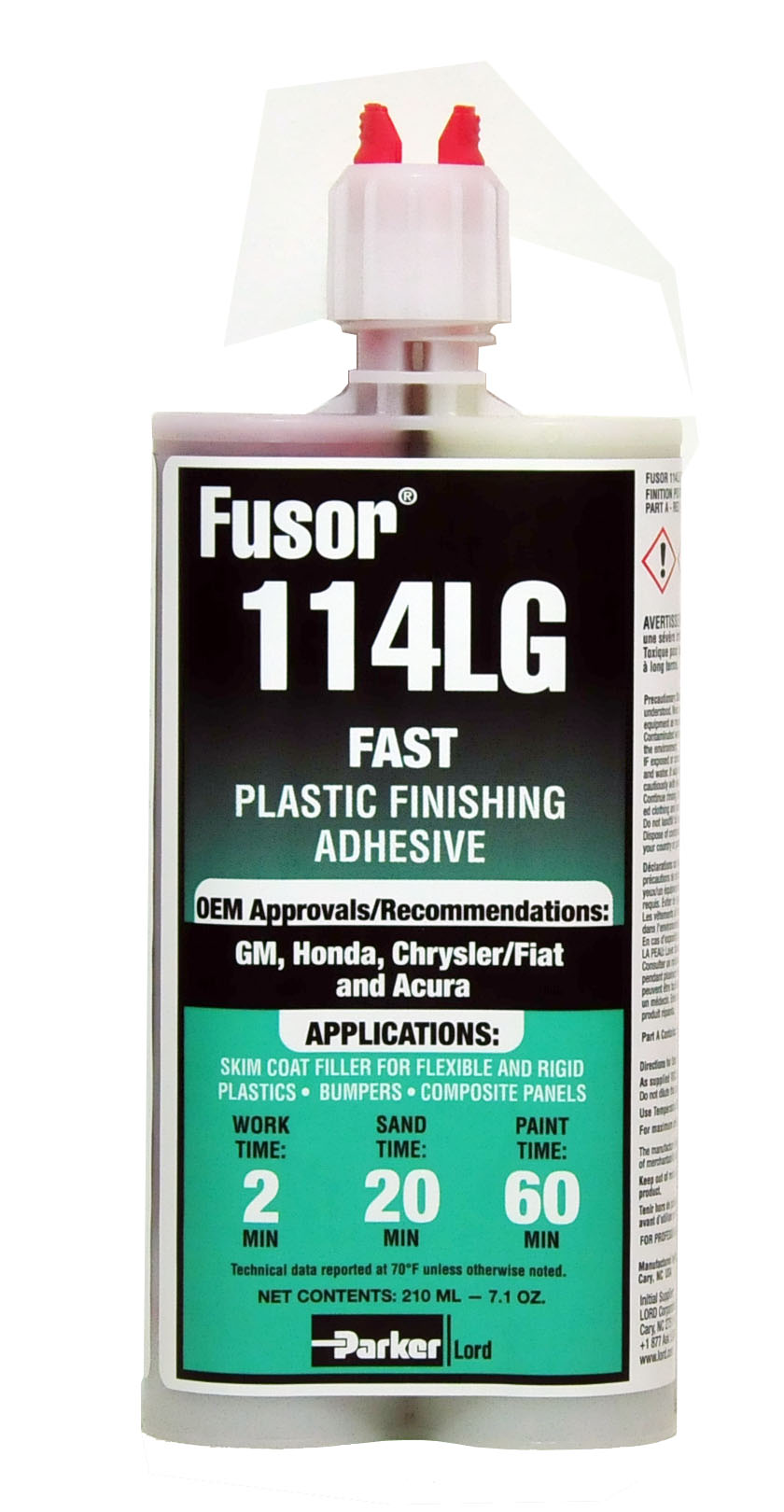 Fusor 114 is the finishing adhesive for all plastic bumpers, body panels and hoods. The work time is very fast, and the cured surface can be sanded in 15 mins to a very fine finish.